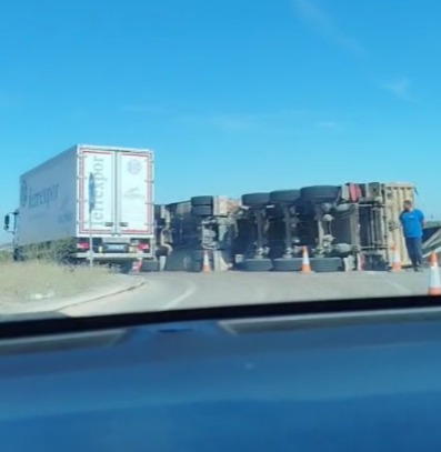 El vehículo articulado quedó volcado sobre un lateral, con conos señalizando la zona y operarios trabajando en el entorno. La carga que llevaba, de residuos agrícolas, quedó volcada. Intervino la guardia civil colocando conos y facilitando la circulación en la vía.