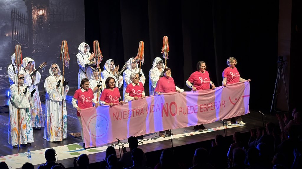 Pancartas contra los fallos del cribado de cáncer de mama irrumpen en el Carnaval de Cádiz y Arahal
