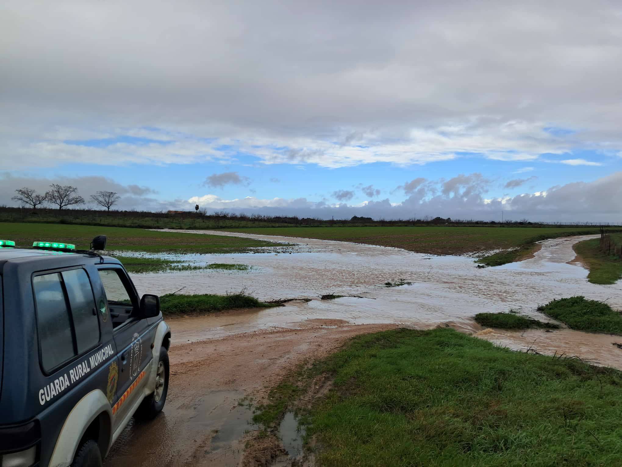 La Policía Local de Arahal acaba de cortar el camino de servicio que une las carreteras de Arahal/El Coronil-Villamartín con la carretera Arahal/Morón. El río Saladillo, a su paso por la zona comercial se ha desbordado inundando dicho camino y convirtiéndolo en inaccesible.