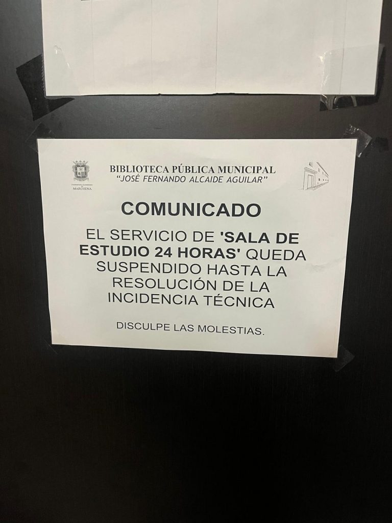 Los usuarios de la Biblioteca Pública Municipal José Fernando Alcaide Aguilar han trasladado su malestar por los continuos fallos del sistema informático que permite el acceso a la sala de estudio durante las 24 horas del día. La situación ha quedado reflejada en un cartel colocado en la puerta del edificio que informa de la suspensión temporal del servicio hasta que se resuelva una incidencia técnica.