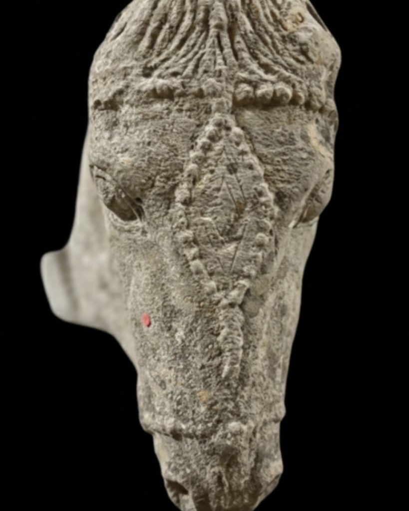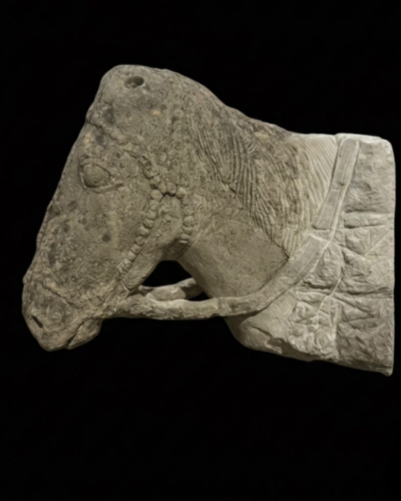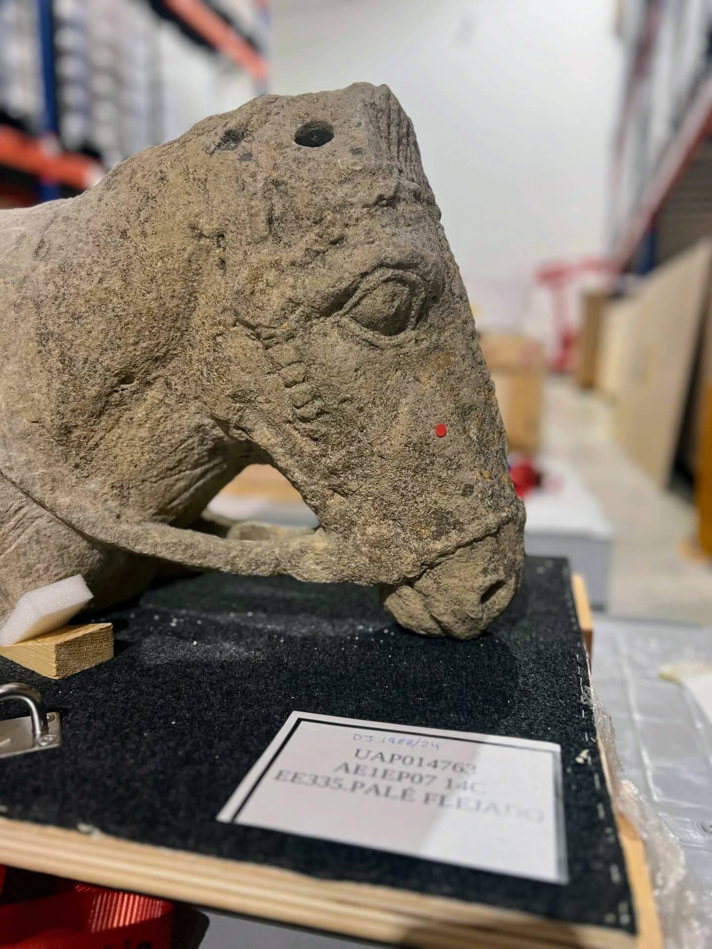 Según la información compartida por el Arqueológico, la pieza pudo pertenecer a una escultura completa integrada en un monumento funerario turriforme. Entre los rasgos descritos figuran las perforaciones donde se insertarían unas orejas hoy perdidas, así como un elaborado cabezal decorado con esferas y riendas acintadas con rebordes, resultando especialmente significativa la ausencia de bocado. El acabado posterior, con aspecto semejante al de un sillar, refuerza la hipótesis de que formó parte de una gran estructura arquitectónica, y el museo recuerda además un episodio llamativo de su “biografía moderna”: tras el hallazgo, estuvo años colocada como trofeo en la entrada de una casa señorial (contenido de la publicación facilitada por el usuario).