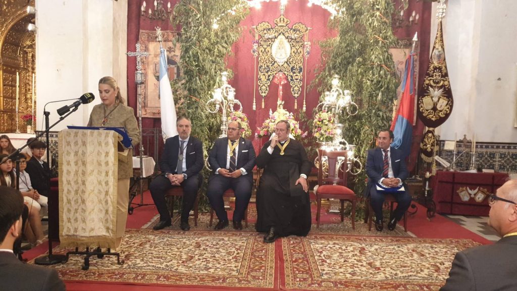 Abrió el acto el rezo del Ángelus, presidido por el director espiritual de la hermandad, don Manuel Chapar Rovera, párroco de San Juan y San Sebastián, junto al vicario parroquial padre Fidel y el rector del convento de San Agustín de las Mercedarias de Calzadas, padre Carlos San José. La oración marcó desde el principio el tono litúrgico de una velada que quería ser, más que un pregón, una plegaria colectiva.