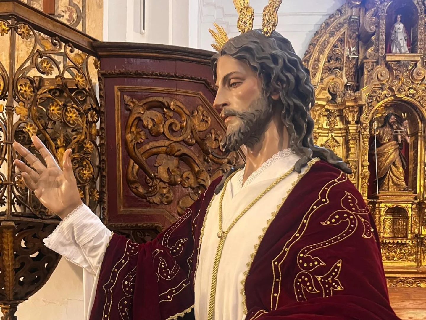 La Virgen de las Angustias (Hermandad del Cristo de San Pedro) custodia otra pieza excepcional. Su palio es uno de los pocos ejemplares que conserva toda su plateria antigua de forma íntegra en la provincia.