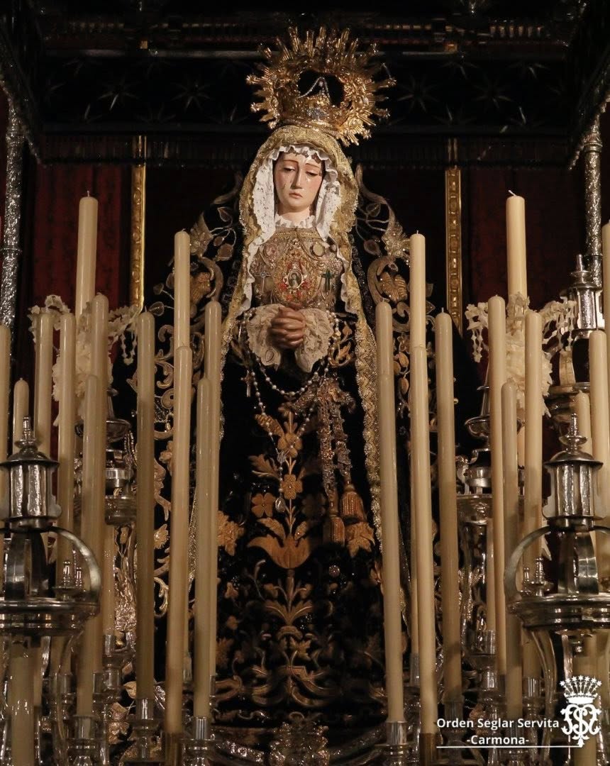 La Fraternidad Seglar de los Servitas de Carmona celebra este viernes la salida procesional de la Virgen de los Dolores, en el marco de la festividad de Santa María al pie de la Cruz. La imagen recorrerá las calles del centro histórico a partir de las 20:30 horas, culminando una jornada de cultos y actos devocionales que se desarrollan a lo largo de todo el día.