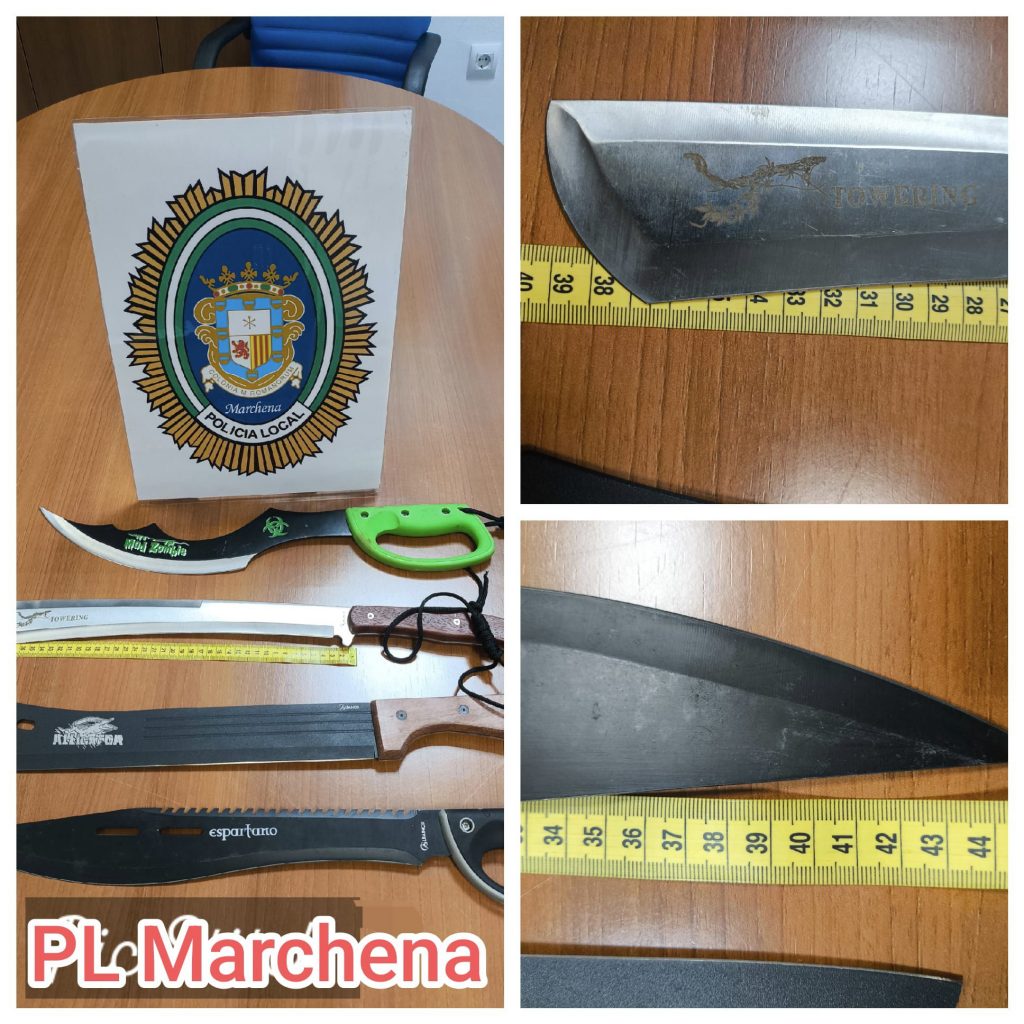 La pasada madrugada dejó una intensa actividad para la Policía Local de Marchena, que tuvo que intervenir en un intento de robo, varios incidentes de tráfico, molestias vecinales por ruidos y diversos controles de seguridad ciudadana que se saldaron con la incautación de cuatro machetes o cortacañas de grandes dimensiones portados por individuos con antecedentes por delitos contra el patrimonio. Así lo ha informado la propia Jefatura policial en su balance de actuaciones difundido este sábado.