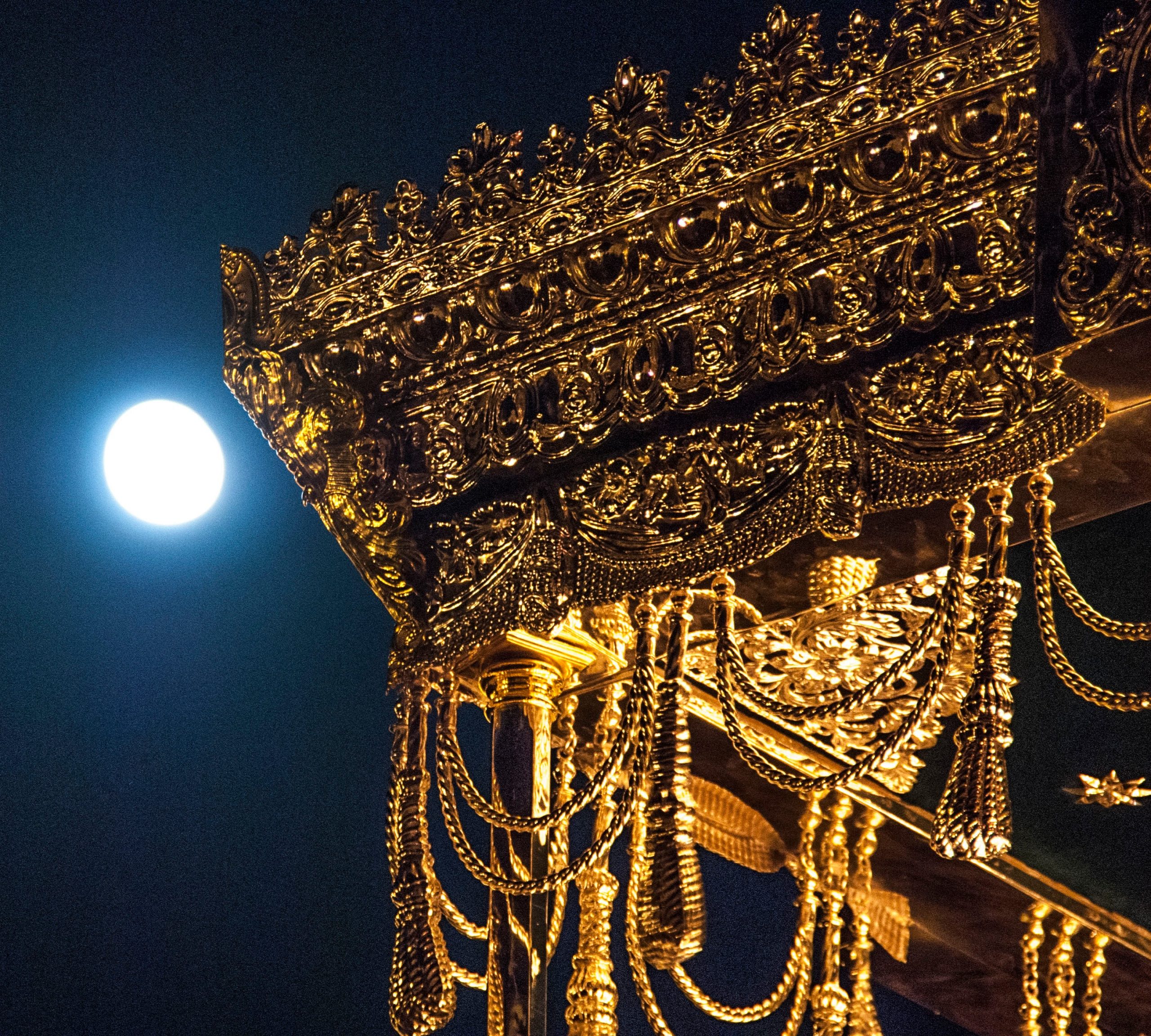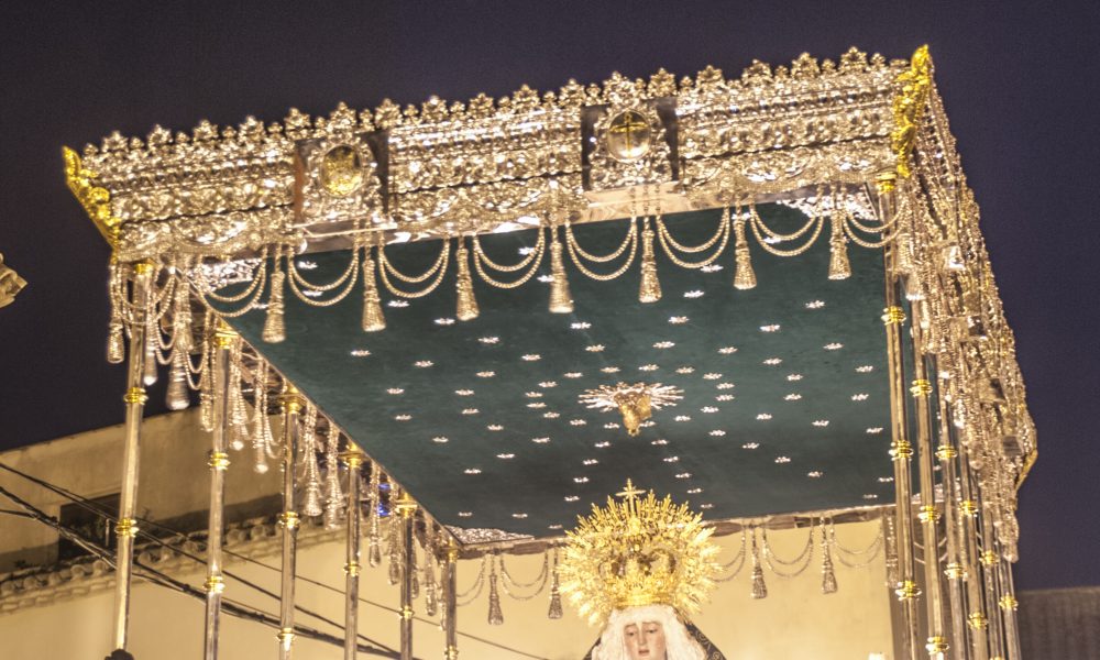 En Marchena, la Virgen de la Soledad procesiona sobre un paso cuya crestería fue realizada por José María Olavide en 1863. Esta pieza, en plata de ley con diez varales, presenta escudos sobredorados que aportan un contraste cromático propio del gusto isabelino. No obstante, el punzón de Olavide ha sido interpretado por algunos autores como una marca de restauración, sugiriendo que la base del palio podría ser incluso más antigua, datando de finales del XVIII.
