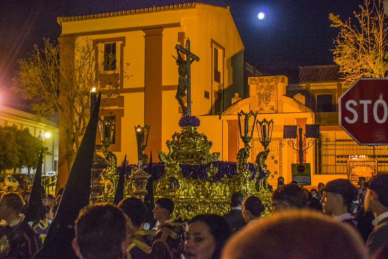 El paso del Cristo, mandado por Jesús Díaz y Jesús Clavijo, dejó una salida sobria y emocionante, con los característicos lirios morados y ese conjunto de elementos que hacen de la Vera Cruz una cofradía singular en Marchena: la piña procesional, los grandes faroles de guardabrisa sostenidos por ángeles, la pequeña dolorosa del frontal del paso, y ese rezo constante bajo las trabajaderas que convierte cada chicotá en una forma de oración. Los costaleros no sólo andan: rezan. Y ese matiz, invisible para quien no lo sabe, explica buena parte de la personalidad de esta hermandad.