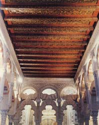 En lo técnico, lo que hace “particulares” a estas armaduras es que la decoración no era un añadido independiente, sino que convivía con una carpintería estructural muy precisa. En un trabajo clásico sobre las techumbres de la etapa de Abderramán I, Manuel Nieto Cumplido explica que, al aparecer las cajas originales en los muros (mechinales) durante obras del siglo XX, pudo deducirse que el artesonado plano se organizaba con tirantes (elementos horizontales) separados unos 85 centímetros entre ejes, funcionando como parte del sistema resistente: a cada tirante correspondía una “tijera” (estructura de pares) que apoyaba sobre él y formaba los faldones de la cubierta. Es decir, no era solo “techo bonito”: era ingeniería de madera, repetida en serie.