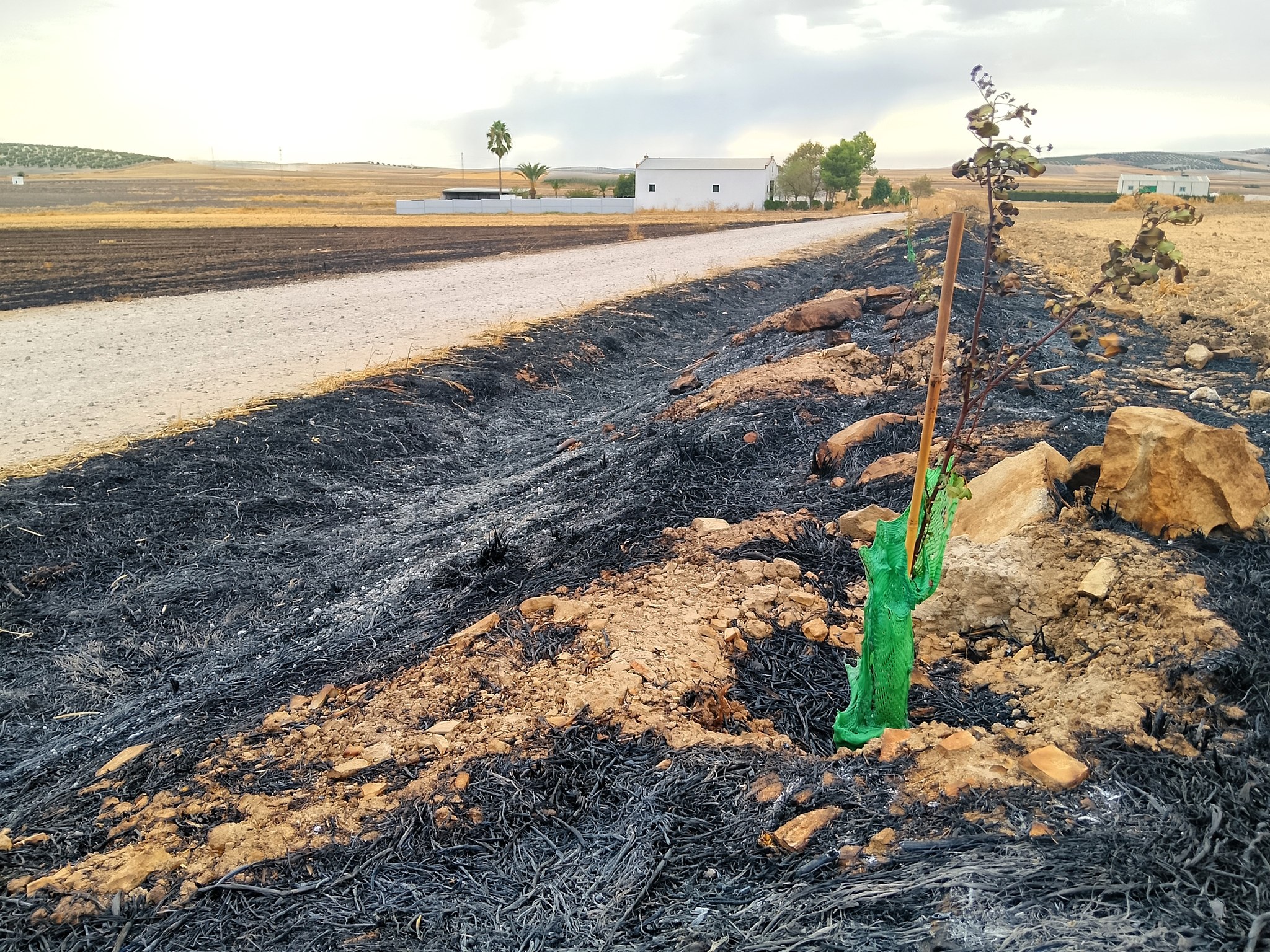 El primero de los siniestros se produjo el sábado en el cordel de Écija, donde el fuego arrasó con más de 300 ejemplares de porte mediano, principalmente acebuches y algarrobos, que habían sido plantados hace cuatro años por El Taller Verde – Ecologistas en Acción Marchena.