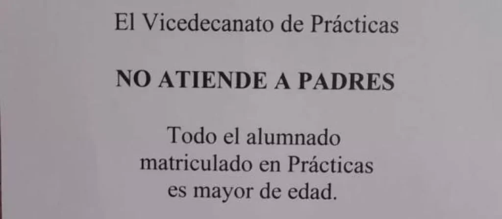 El Vicedecanato de Prácticas de la Facultad de Ciencias de la Educación de la Universidad de Granada ha colocado un aviso en sus tablones: “No se atiende a padres. Todo el alumnado matriculado en Prácticas es mayor de edad”. La imagen, difundida en X por el catedrático de la UGR Daniel Arias Aranda, se viralizó el 20 de octubre y abrió un debate sobre el papel de las familias en la etapa universitaria. La dirección del área en la facultad subraya que el mensaje pretende recordar que la relación académica se establece con el estudiante, no con sus progenitores.